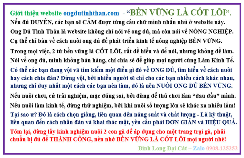 => Đừng nghe những lời nói “bùi tai” và đừng tin những thứ “phông bạt”, nên tìm người có TÂM & TẦM. Hãy nhìn xa, vì đó là lý do mình nói “Tận dụng nguồn hoa trong nông lâm nghiệp vườn rừng“. Ong dú không chỉ giúp làm giàu mà còn có lợi cho nông nghiệp sạch hay sức khỏe cộng đồng. Nghĩa là vừa giúp kinh tế cho bản thân, vừa mang lại nhiều lợi ích cho xã hội sau này.