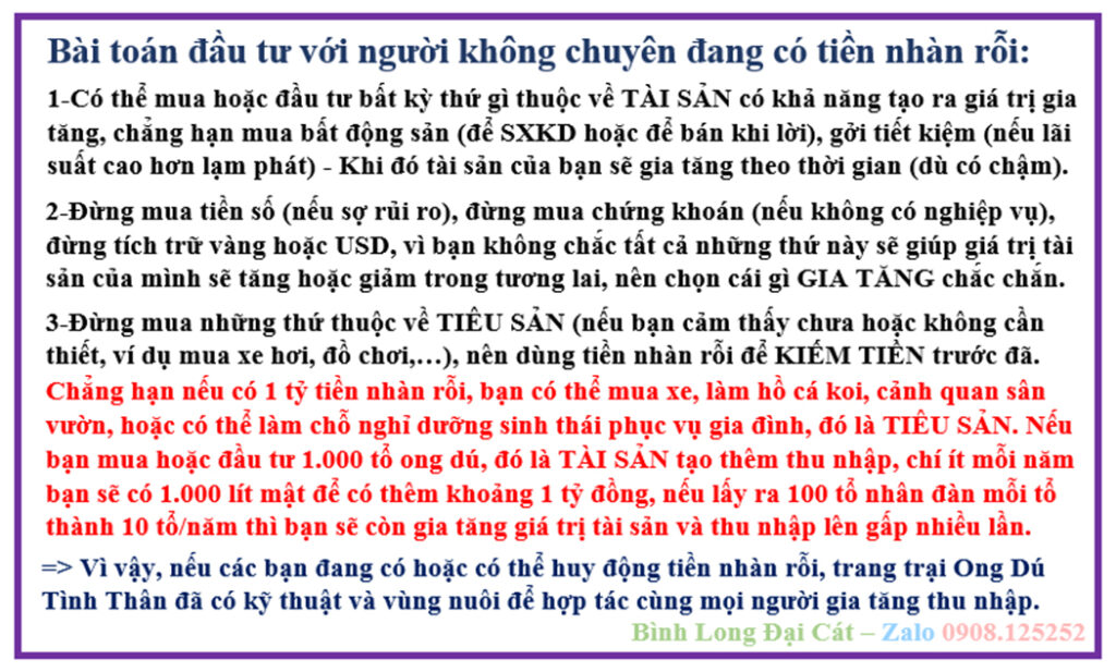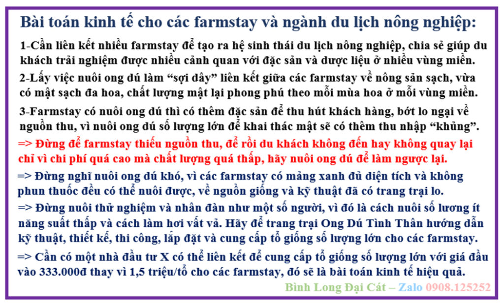 Trường hợp [1] (có 6 tỷ): Trang trại giúp mua gom tổ giống, 20% nhân đàn, 80% khai thác mật (Có hỗ trợ kỹ thuật, SXKD) => Trong 01 năm độc chiếm thị trường, vừa thu mật vừa gia tăng tổ giống (320%/năm), sau 03 năm sẽ có triệu USD.
