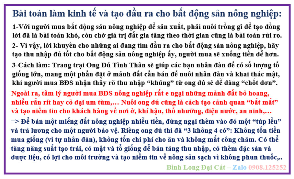 Vì yếu tố NIỀM TIN, thị trường luôn yêu cầu nông sản phải SẠCH THẬT chứ không phải sạch theo kiểu niềm tin “trên giấy”. Niềm tin tiêu dùng liên quan trực tiếp đến SỨC MUA trên thị trường. Bởi vậy mình khuyên những người làm nông sản sạch cứ mạnh dạn nuôi ong dú. Chỉ vì ong dú không thể chung sống với thuốc BVTV độc hại. Nghĩa là những vùng nuôi ong dú sau này sẽ được xem là vùng có “giấy chứng nhận” làm nông sản sạch, chẳng phải cần chứng minh gì cả.