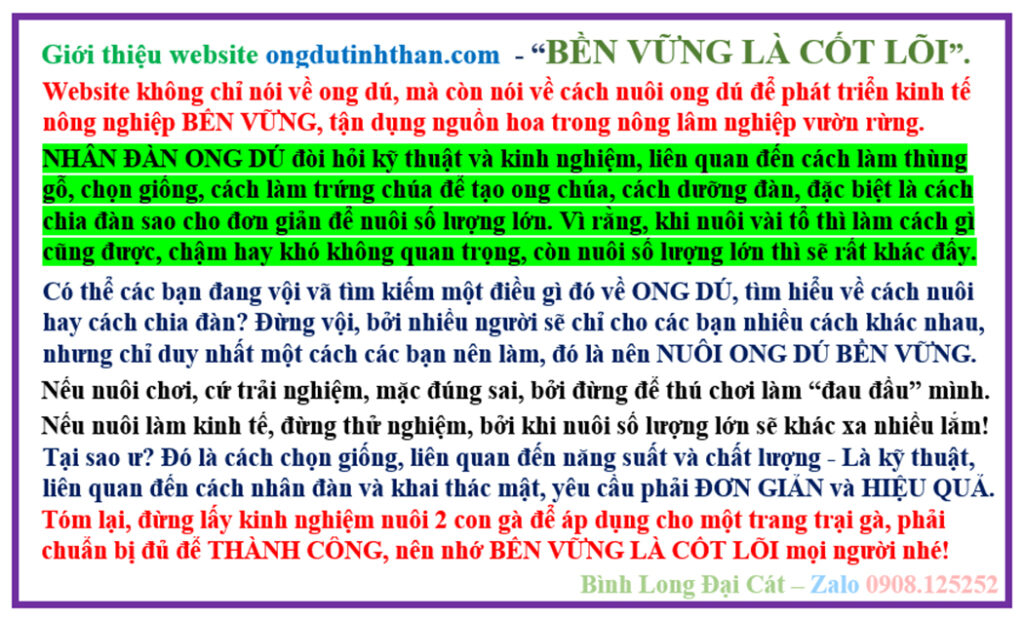 Có thể tham khảo thêm ở nhóm Zalo NUÔI ONG DÚ BỀN VỮNG, hoặc bài viết Facebook Bình Long Đại Cát trên những hội ong dú, hữu duyên sẽ gặp, Zalo 0908.125252.